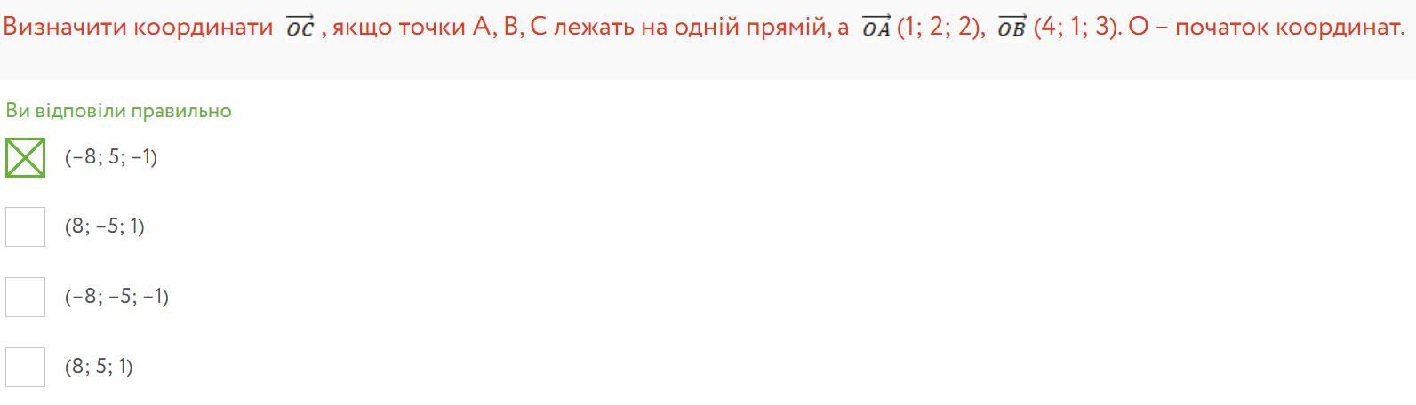 Визначити координати вектора ОС , якщо точки А, В, С лежать на одній прямій, вектор ОА (1; 2; 2), вектор ОВ (4; 1; 3). точка O – початок координат.