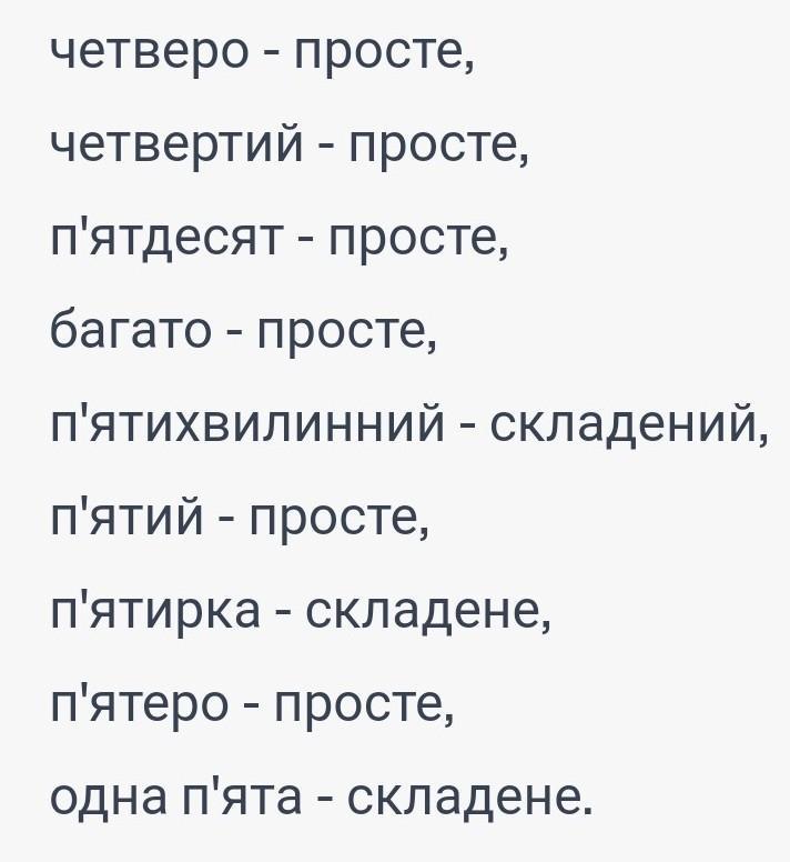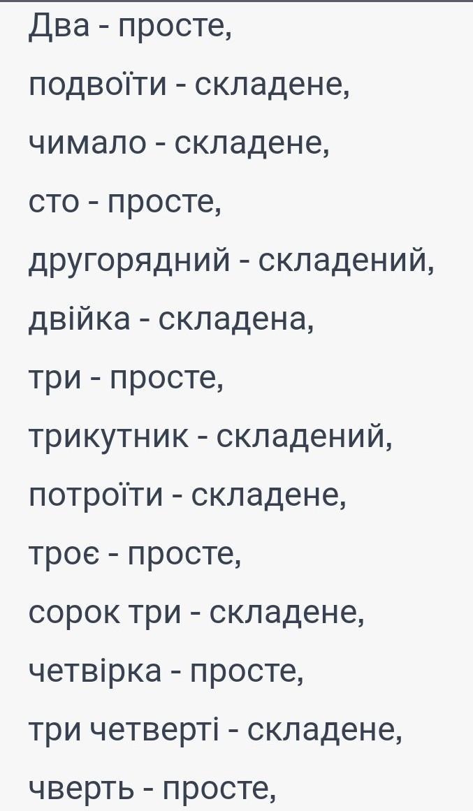 1.Знайти числівники і визначити їх будову(прості, складні, складені). Два, подвоїти, чимало, сто, другорядний, двійка, три, трикутник, потроїти, троє, сорок три, четвірка, три четверті, чверть, четверо, четвертий, п'ятдесят, багато, п'ятихвилинний, п’ятий, п'ятірка, п'ятеро, одна п'ята.