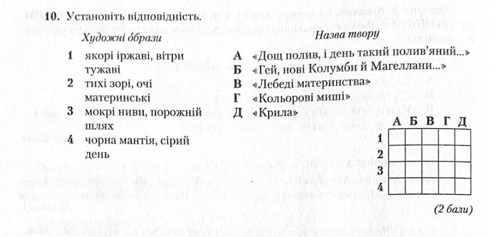 1- д: вітри тужаві зничить хтось літає чим крилами;2-в материнські очі лебеді материнства;3-а мокрі ниви значить був дощ і він полив;4-г тому що спочатку все було сіре а далі кольорове