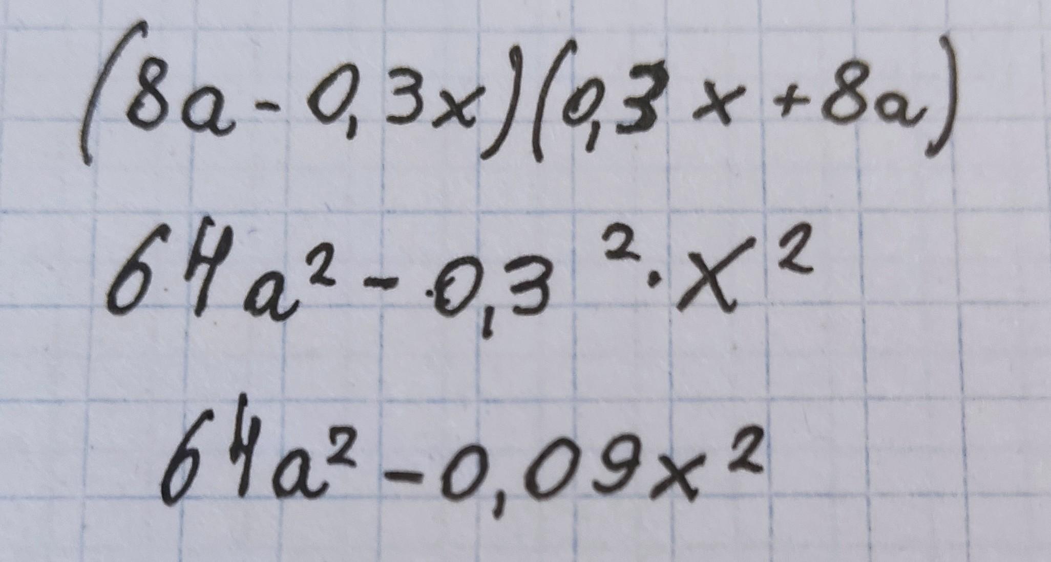 (8a-0.3x)(0.3x+8a) = (8а)^2 - (0,3х)^2 = 64a^2 - 0,09x^2