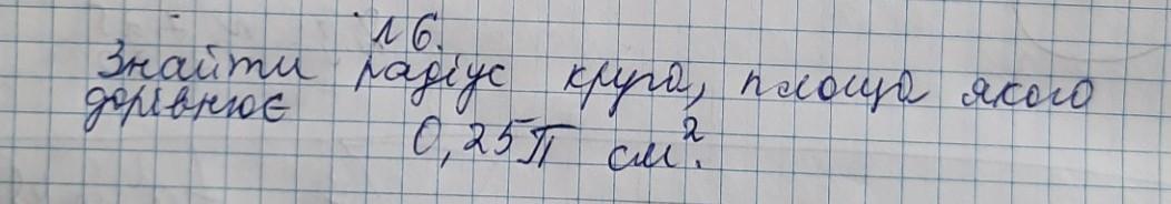Задано, що площа круга дорівнює 0,25π см². Тоді, підставляючи це значення у формулу, маємо:
