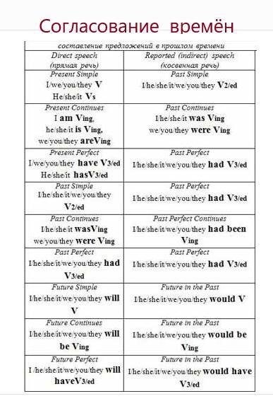 В косвенной речи, если глагол главного предложения стоит в прошедшей форме, обязательно используются правила согласования времен. Также меняются местоимения и наречия.