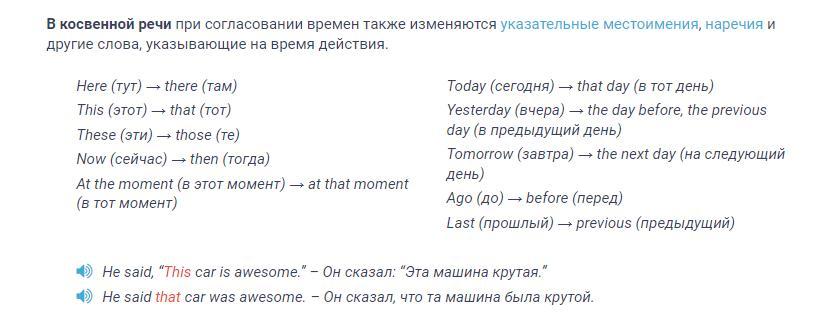 - Если говорящий пересказывает свои собственные слова, то местоимения I, we не изменяются.