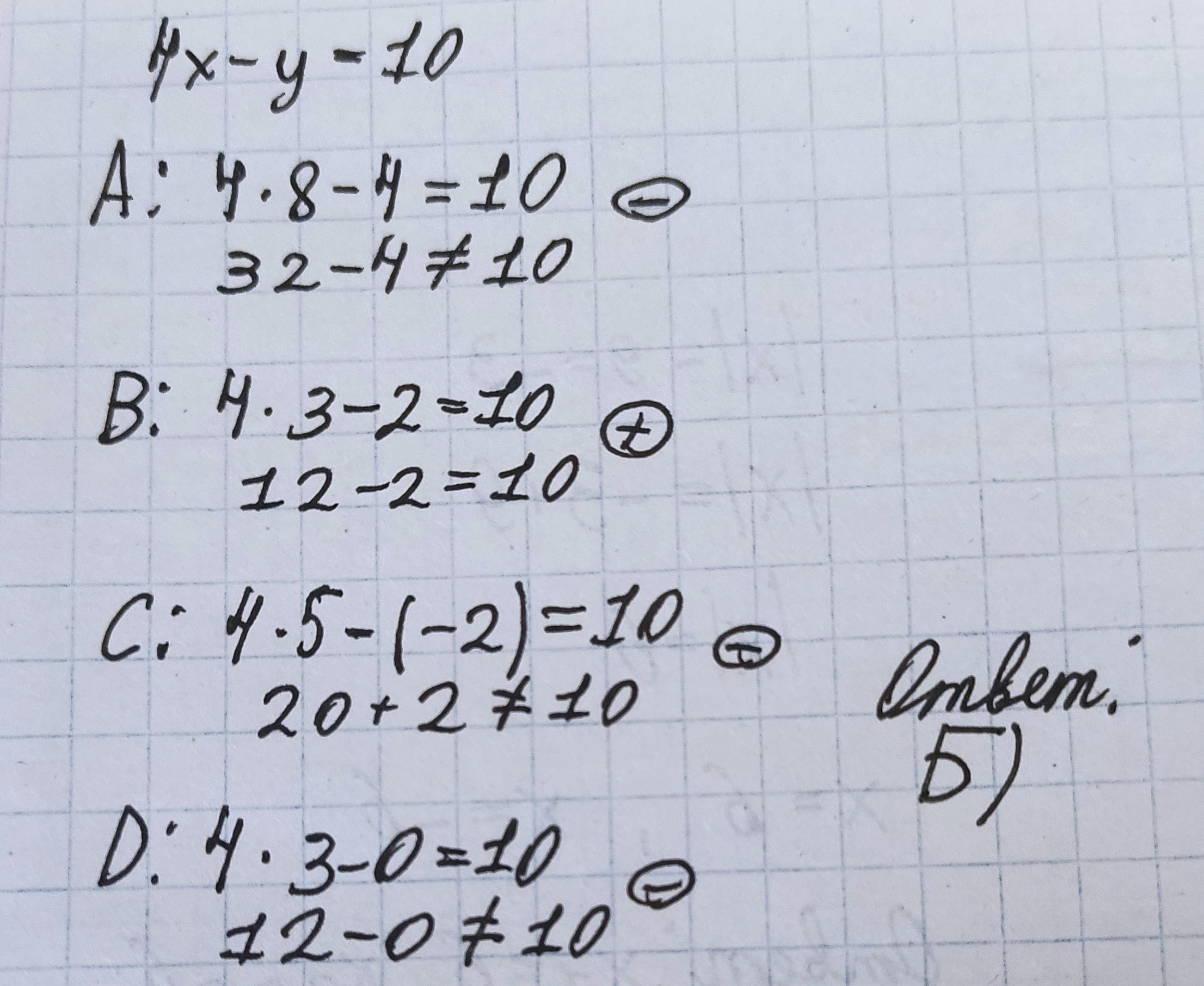 СРОЧНО! Через какую из данных точек проходит график уравнения 4x -y=10. А)- А(8:4); Б)- В(3:2); В)- C(5:-2); Г)- D(-3:0)