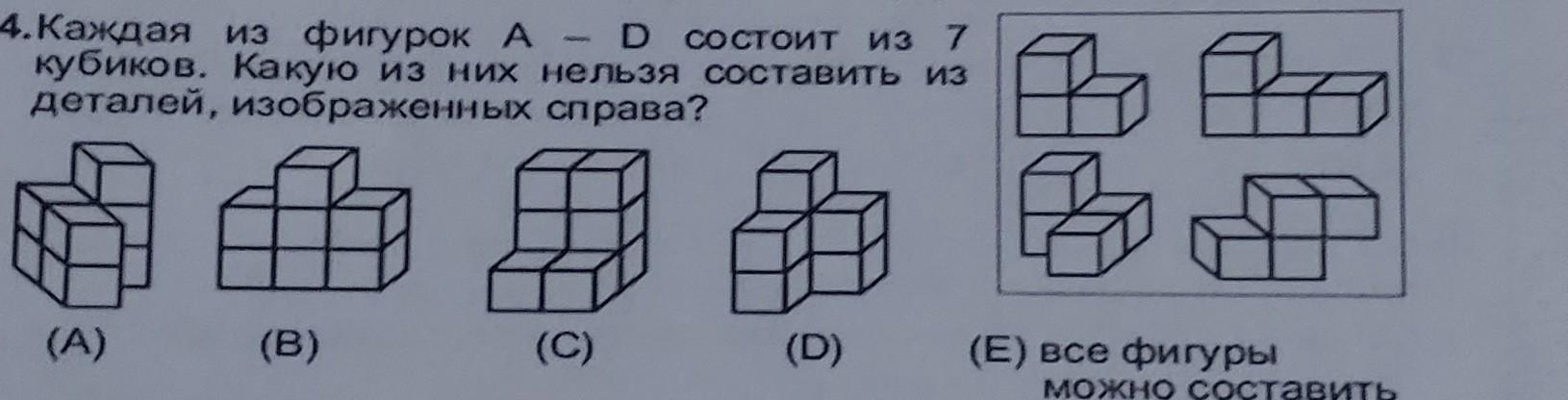 Каждая из фигурок A - D состоит из 7 А кубиков. Какую из них нельзя составить из деталей, изображенных справа? (A) (B) (C) (D) (E) все фигуры можно составить