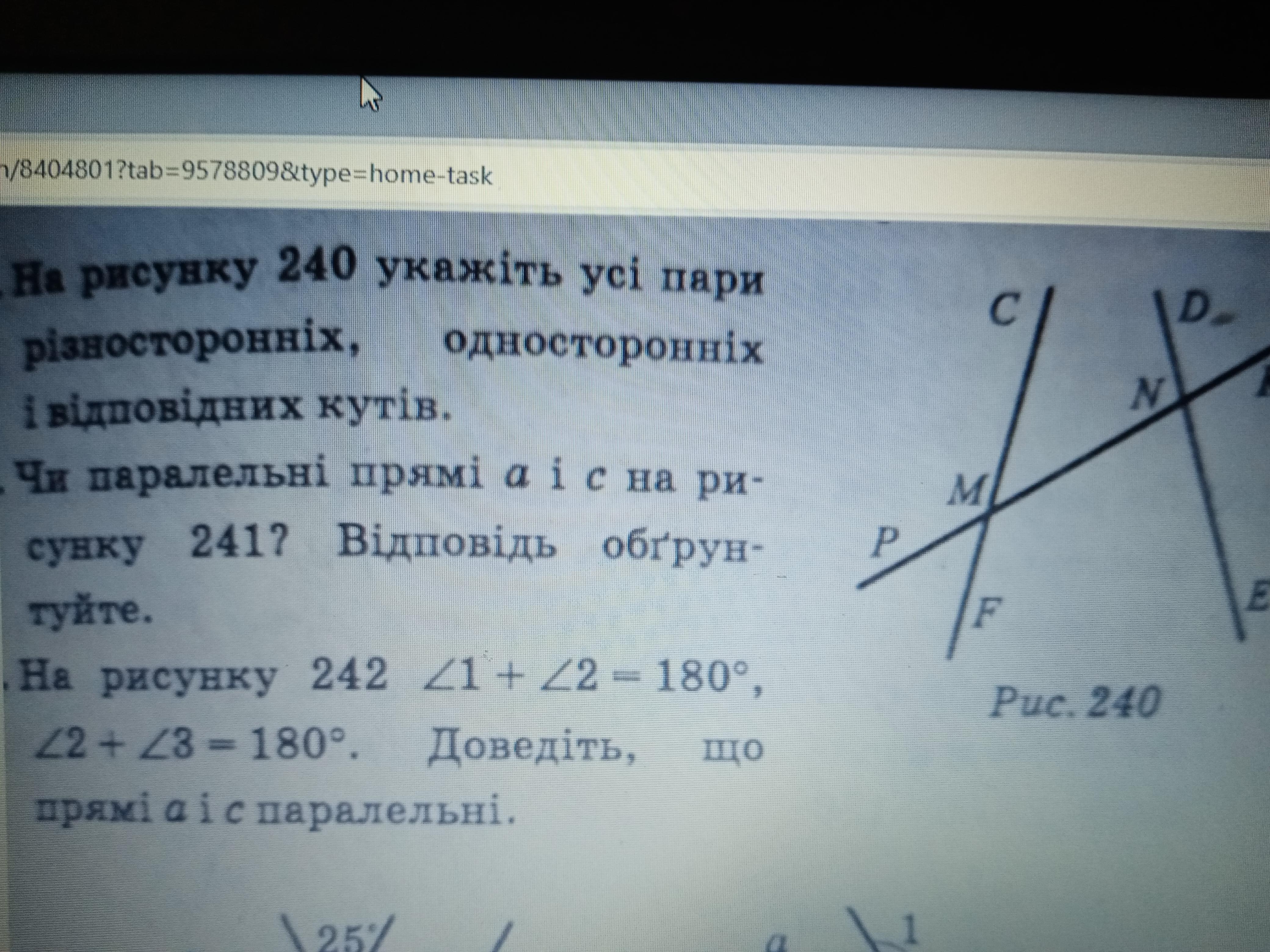 На рисунку 240 укажіть усі пари різносторонніх, односторонніх і відповідних кутів. УМАЛЯЮ ПОМОГИТЕ ДАЮ 30 БАЛЛОВ