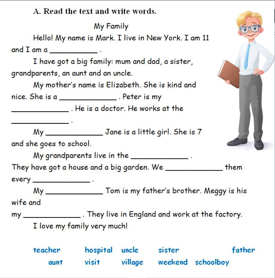 schoolboy,teacher,father,hospital,sister,village,visit,weekend,uncle,aunt. Удачи!