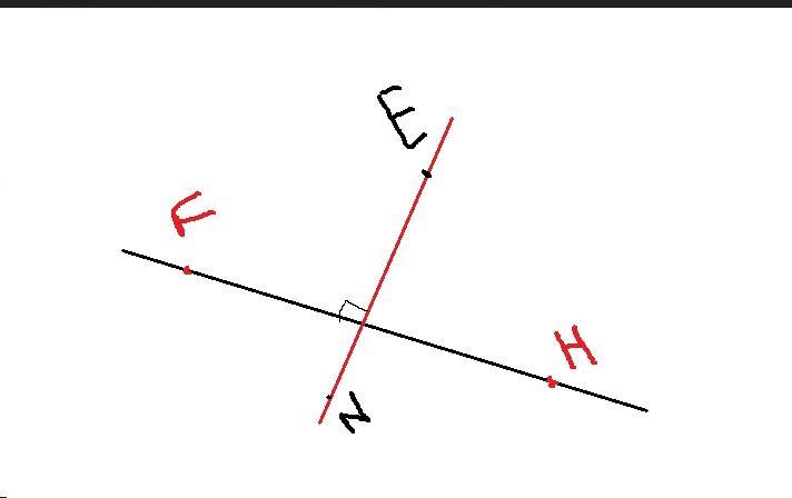 Проведи лінійкою пряму. Познач на ній точки F та H, тоді візьми кутник і проведи під прямим кутом другу пряму та продовж її. Постав на ній точки E та N.