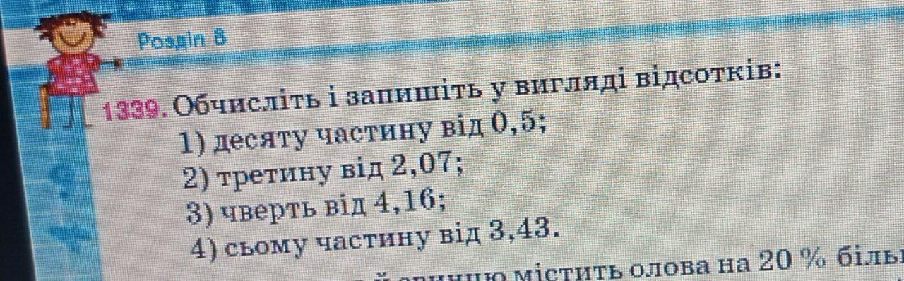 1. Десята частина від 0,5 дорівнює 0,05. Щоб виразити це у відсотках, потрібно перемножити 0,05 на 100%: