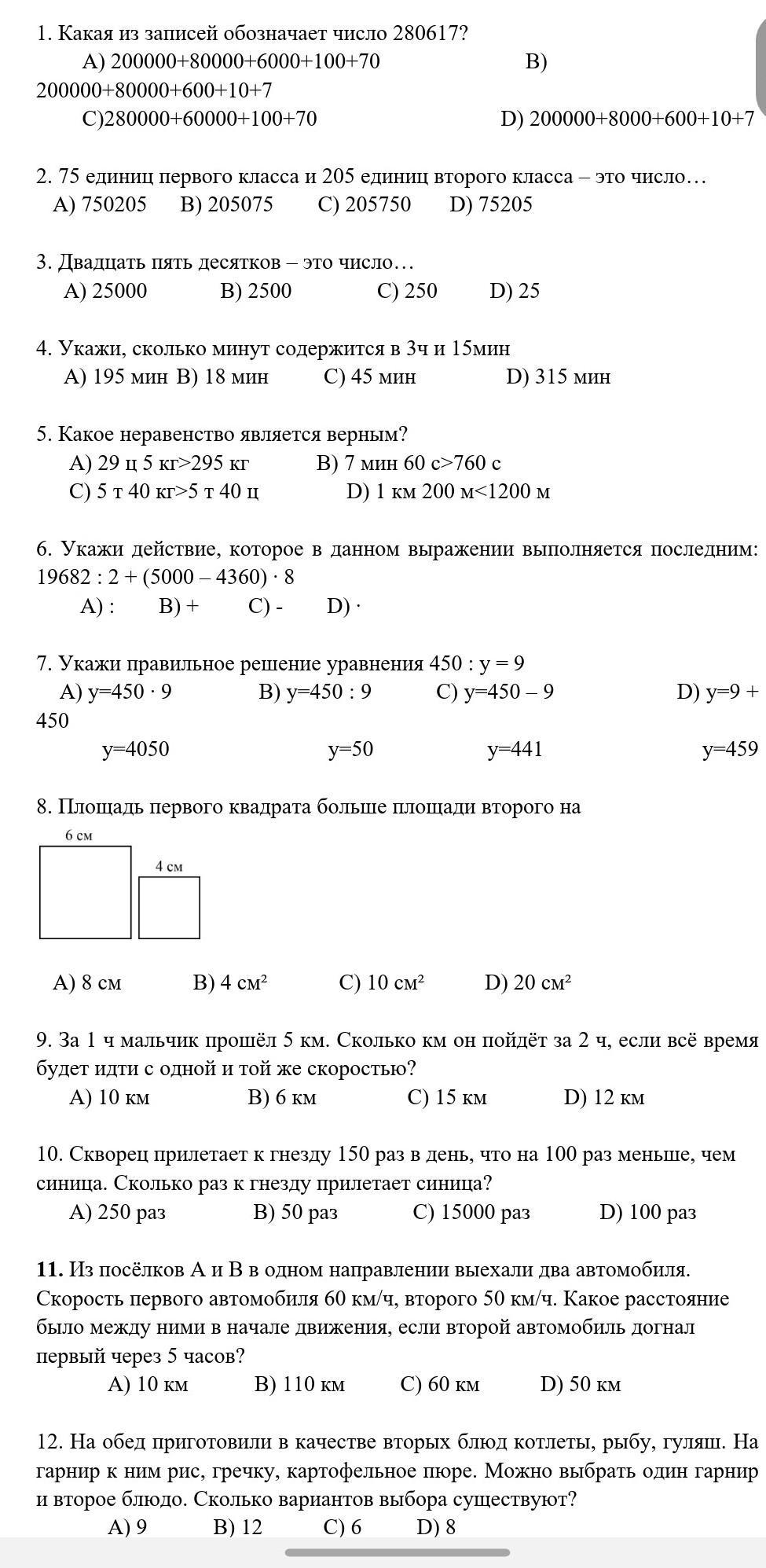 ЭТО ВСЕ СРОЧНО 1. Какая из записей обозначает число 280617? A) 200000+80000+6000+100+70 200000+80000+600+10+7 C)280000+60000+100+70 3. Двадцать пять десятков - это число... A) 25000 B) 2500 C) 250 2. 75 единиц первого класса и 205 единиц второго класса - это число... A) 750205 B) 205075 C) 205750 D) 75205 5. Какое неравенство является верным? А) 29 ц 5 кг>295 кг С) 5 т 40 кг>5 т 40 ц 4. Укажи, сколько минут содержится в 3ч и 15мин А) 195 мин В) 18 мин C) 45 мин y=4050 4 cм B) D) 200000+8000+600+10+7 D) 25 В) 7 мин 60 с>760 c В) 4 см² 6. Укажи действие, которое в данном выражении выполняется последним: 196822+ (5000-4360) 8 A): B)+ C) - D) . 7. Укажи правильное решение уравнения 450 : у = 9 A) y=450 · 9 B) y=450 : 9 C) y=450 – 9 450 y=50 y=441 8. Площадь первого квадрата больше площади второго на 6 см D) 315 мин D) 1 км 200 м