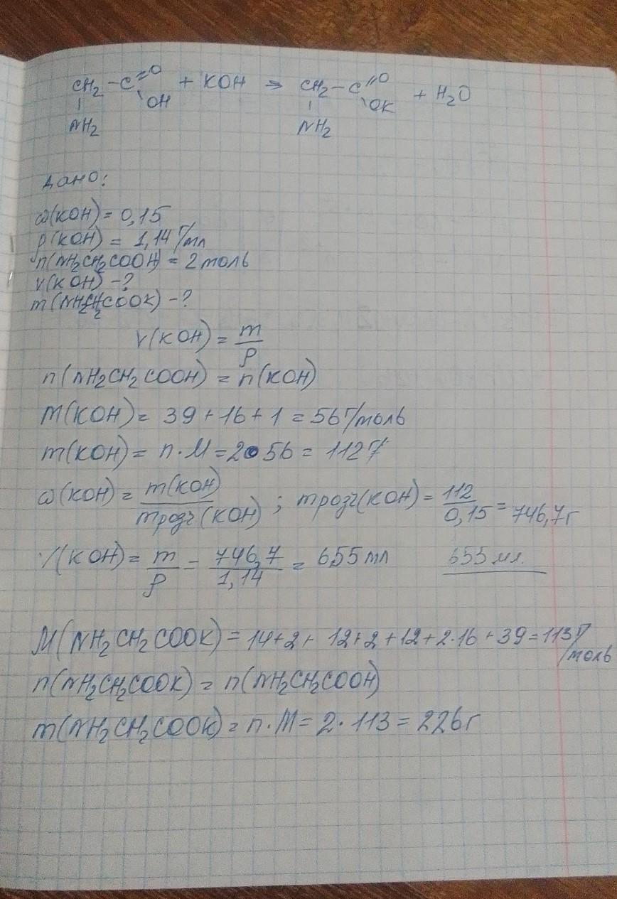 Який об’єм розчину лугу, що містить 15% калій гідроксиду ( густина 1,14 г/мл ) необхідний для нейтралізації 2 моль амінооцтової кислоти. Яка маса солі калій аміноацетату утворилася в ході реакції?
