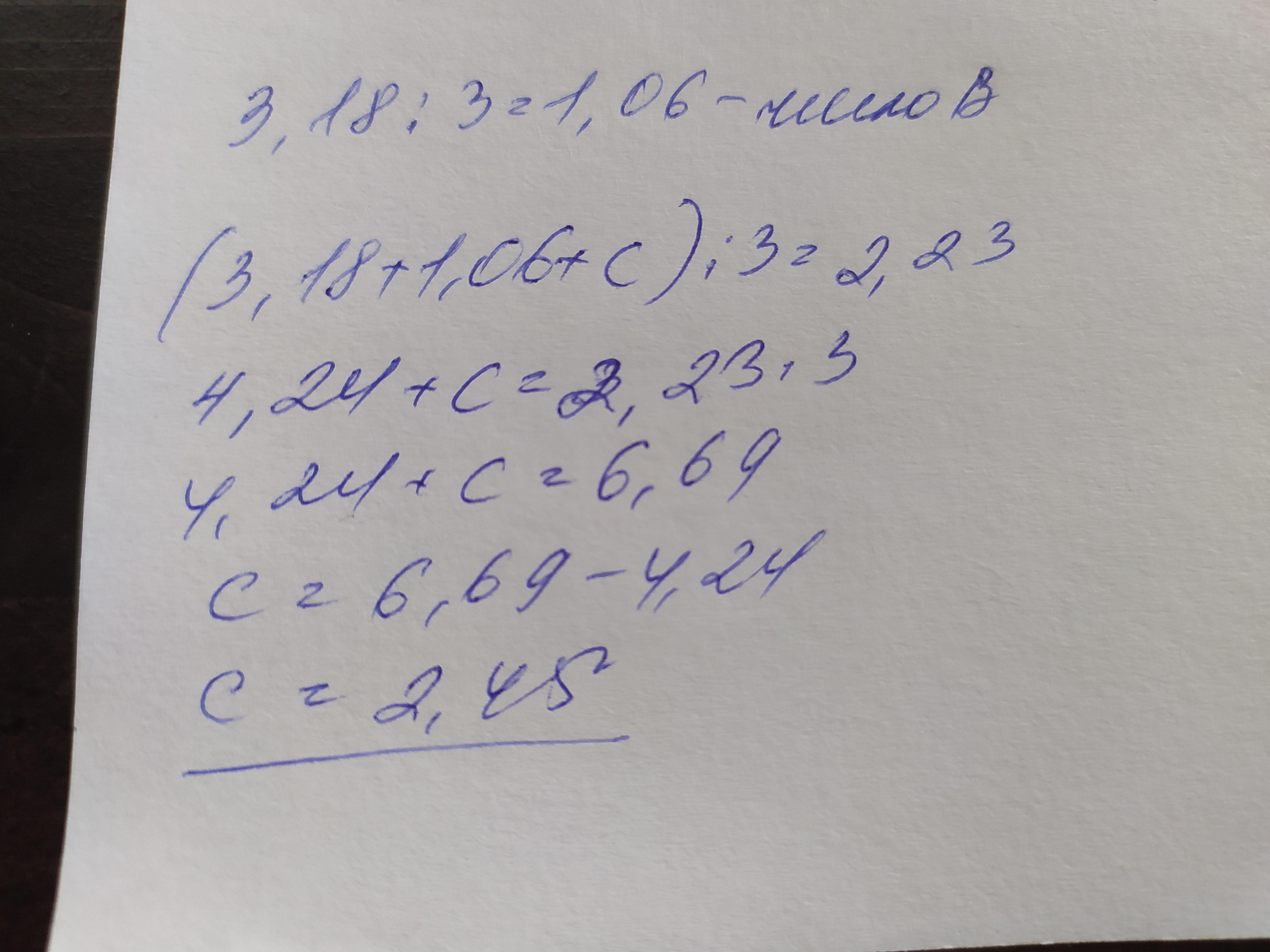 середнє арифметичне чисел а,б,с дорівнює 2,23. Число а= 3,18, число в втричі менше за число а. Чому дорівнює число с?ДАЮ 12 БАЛІВ