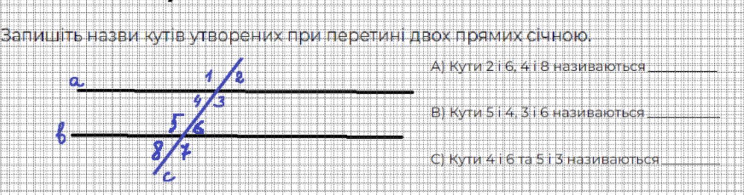 Запишіть назви кутів утворених при перетині двох прямих січною.
