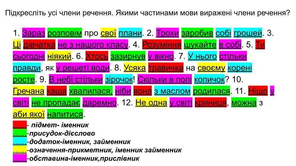 Підкресліть усі члени речення. Якими частинами мови виражені члени речення? 1. Зараз розповім про свої плани. 2. Трохи заробив собі грошей. 3. Ці дівчатка не з нашого класу. 4. Розуміння шукайте в собі. 5. Ти сьогодні ніякий. 6. Хтось зазирнув у вікно. 7. У нього стільки правди, як у решеті води. 8. Усяка травичка на своєму корені росте. 9. В небі стільки зірочок! Скільки в полі копичок? 10. Гречана каша хвалилася, ніби вона з маслом родилася. 11. Ніщо у світі не пропадає даремно. 12. Не одна у світі криниця, можна з абиякої напитися.