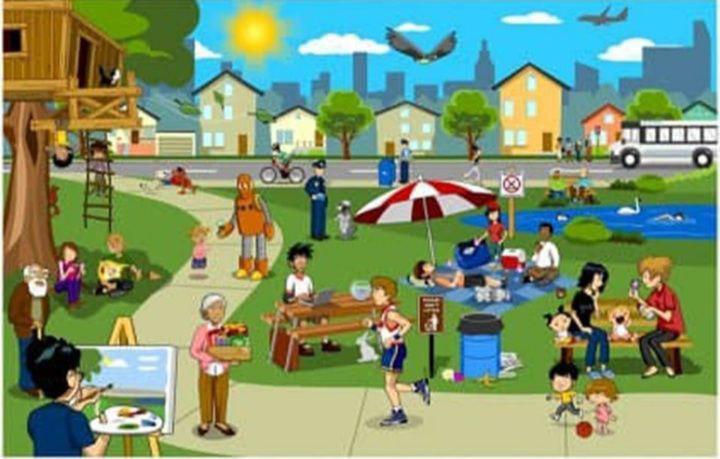 Sunny day. There is not a cloud in the sky, an airplane and an eagle are flying in the sky. A bus is driving along the road, a postman is delivering mail, a girl is running on the sidewalk, a company of people is standing on another sidewalk and chatting about something. People are relaxing in the park. A group of friends has a picnic. People are sitting near a lake in which swans are swimming. A boy with a guitar and a girl with a book are sitting near a path under a tree. A squirrel climbs a tree, and a wooden house is built on a tree in which they play children. A young couple is sitting near the dumpster (which is already full of garbage) and they want to comfort their child with a rattle, while their other child is watching.There is also a guy sitting at a table near the path doing something on the computer. An athlete is running along the track, while children are playing with a ball next to him, a man is standing next to him giving a little girl ice cream, and an elderly lady is standing on the road with sweets. Grandfather managed to watch this. And the artist paints a picture looking at it.