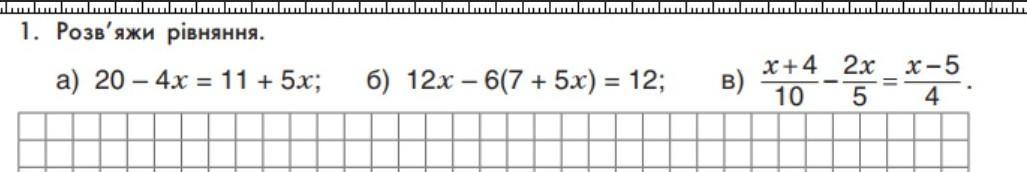 1. Розв'яжи рівняння. a) 20 - 4x = 11 + 5x; 6) 12x6(7 + 5x) = 12; в) x+4 10 2x x-5 -* 5 4 СРОЧНО БУДЬ ЛАСКА!!