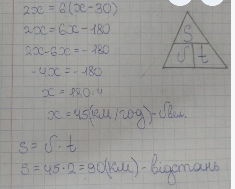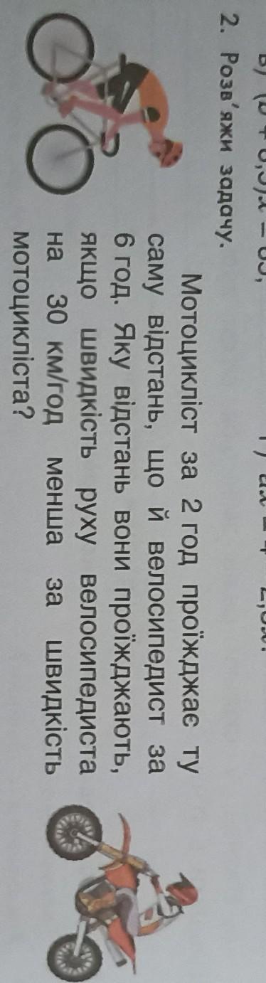 Мотоцикліст за 2 год проїжджає ту саму відстань, що й велосипедист за 6 год. Яку відстань вони проїжджають, якщо швидкість руху велосипедиста на 30 км/год менша за швидкість мотоцикліста?(дам 30 балов!! Ответ написать полностью с рівнянням і умовою)