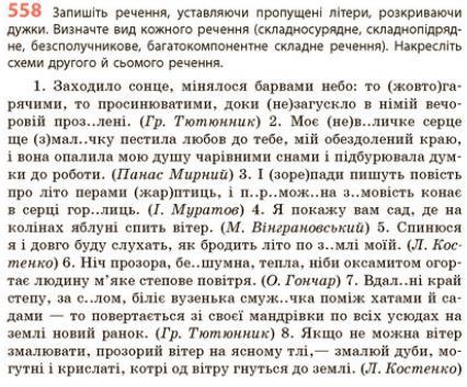 Моє новолічко серце ще трохи пестила любов до тебе, мій обездолений край, і вона опалила мою душу чарівними снами і підбурювала думки до роботи. (Панас Мирний) - складнопідрядне речення. Схема: Підмет - Моє серце, причина - ще трохи пестила любов до тебе, природа місця - мій обездолений край, додаток - і вона, визначення - опалила мою душу чарівними снами, присудок - підбурювала думки до роботи.