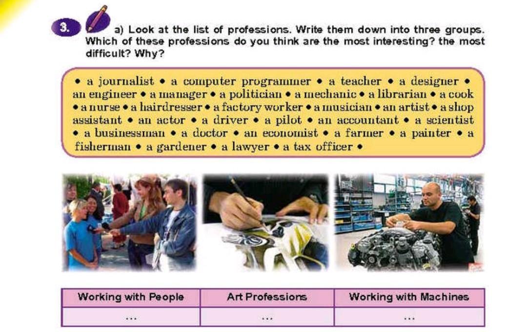 Look at the list of professions. Write them down into three groups/Подивіться список професій. Розпишіть їх на три групи.