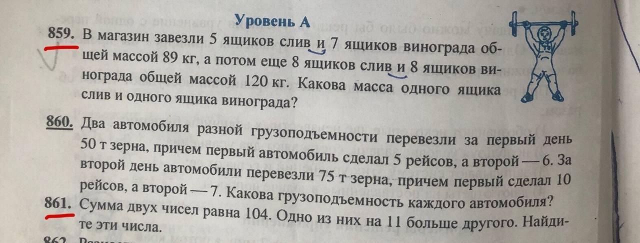 Пусть x кг весит ящик слив, а ящик винограда весит y кг. По условию задачи 5 ящиков слив и 7 ящиков весят 89кг, т.е. 5x + 7y=89, а 8 ящиков слив и 8 ящиков винограда весят 120кг, т.е. 8x + 8y = 120.
