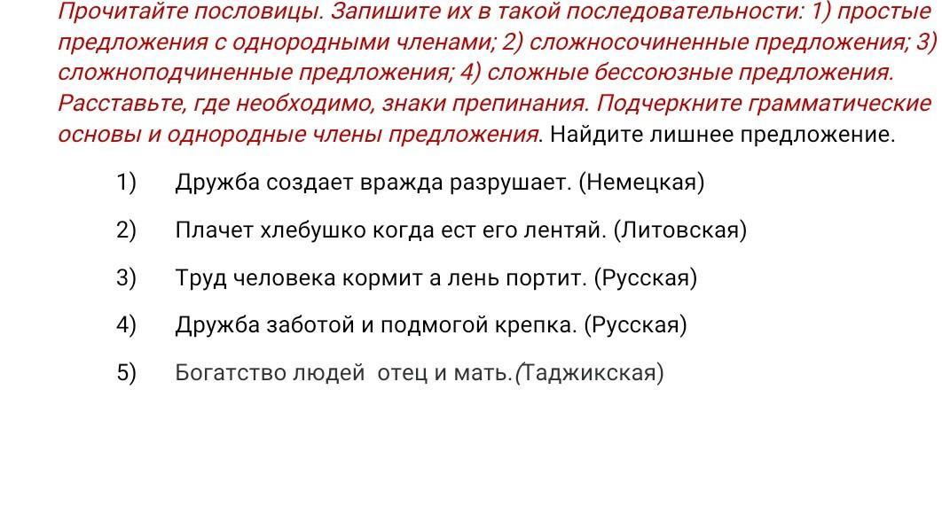 Запишите пословицы в нужной последовательности. Расставьте, где необходимо, знаки препинания. Подчеркните грамматические основы и однородные члены предложения. Найдите лишнее предложение.