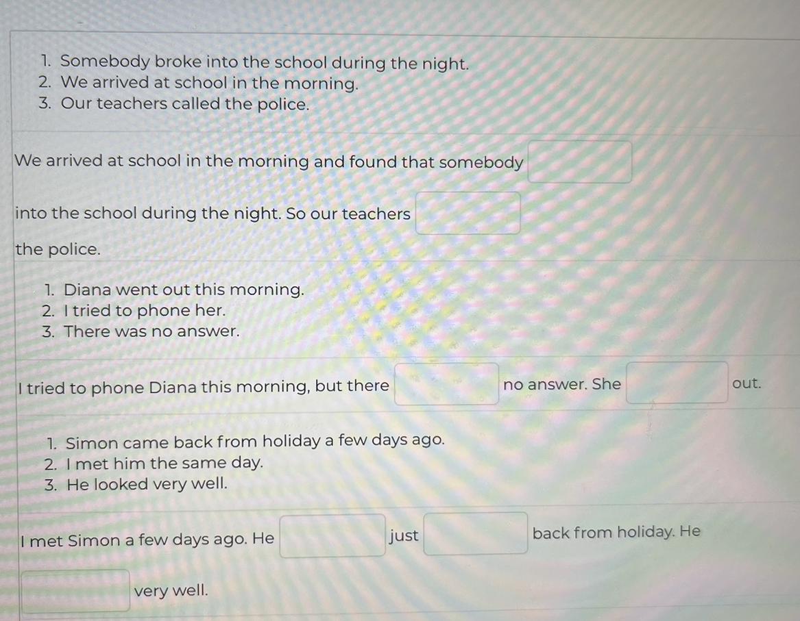 We arrived at school in the morning and found that somebody had broken into the school during the night. So our teachers called the police.I tried to phone Diana this morning, but there was no answer. She just went out.