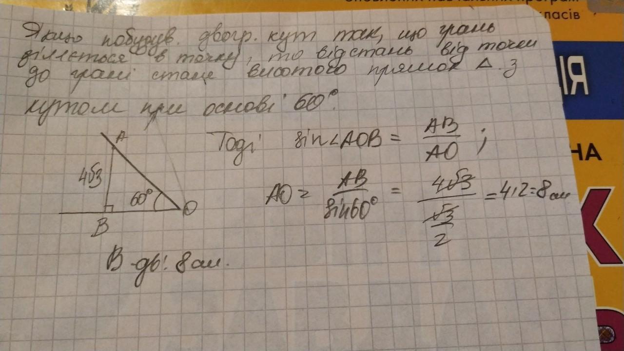 На ребрі двогранного кута величиною 60° узято відрізок завдовжки 4/2 см.