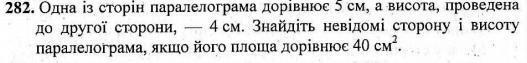 Оскільки площа паралелограма S = 40 см², а висота h = 4 см, то з формули вище можна знайти довжину другої сторони b:
