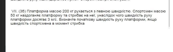 де: маса платформи (x) = 200 кг (маса платформи); маса спортсмена (y) = 50 кг (маса спортсмена) v1 = початкова швидкість платформи y = швидкість спортсмена до зіткнення v2 = кінцева швидкість платформи і спортсмена після зіткнення (3 м/с).