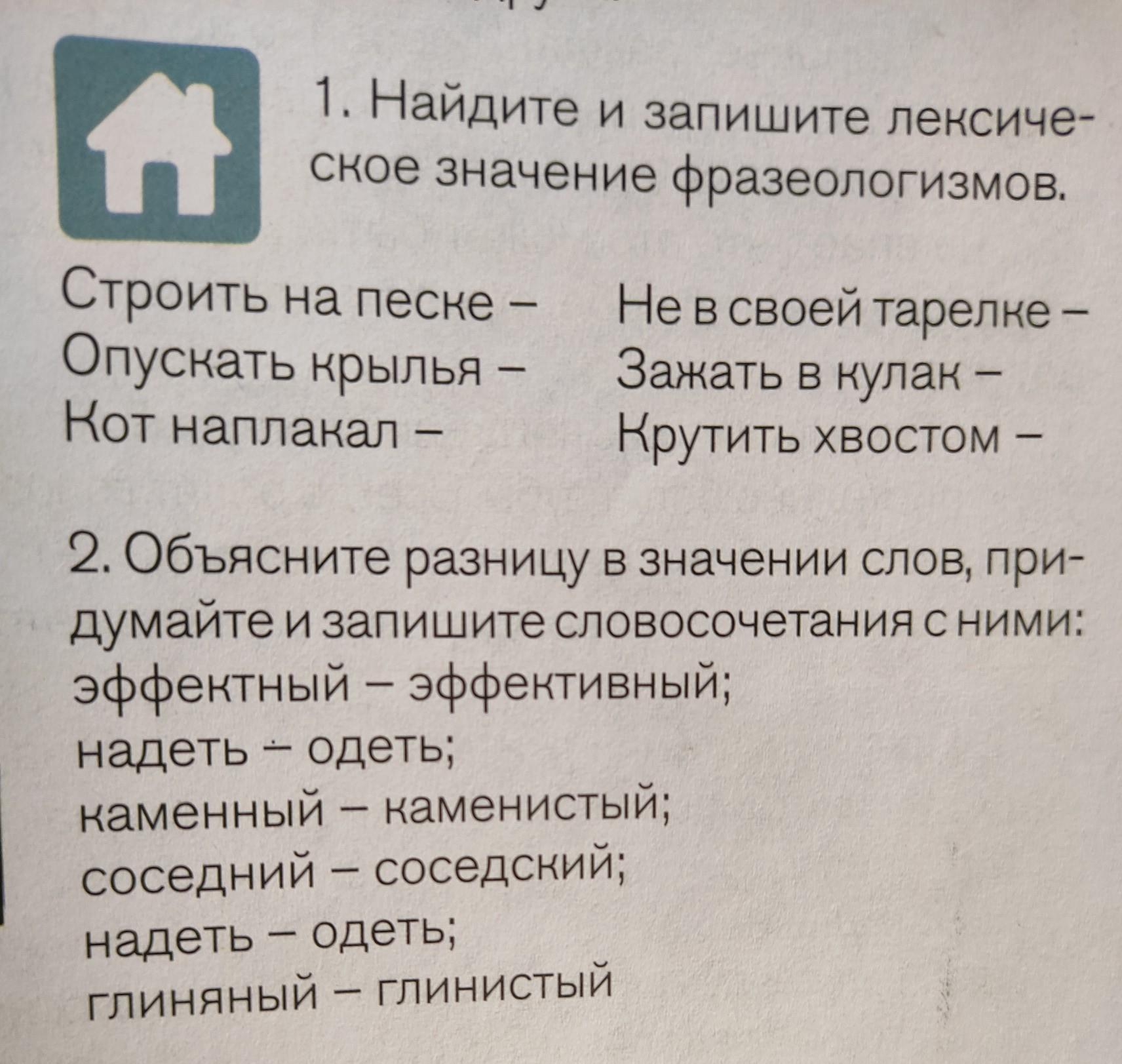 . 1. Найдите и запишите лексиче- ское значение фразеологизмов. Не в своей тарелке - Зажать в кулак - Крутить хвостом Строить на песке - Опускать крылья - Кот наплакал - 2. Объясните разницу в значении слов, при- думайте и запишите словосочетания с ними: эффектный – эффективный; - надеть - одеть; каменный - каменистый; соседний-соседский; - надеть - одеть; глиняный-глинистый