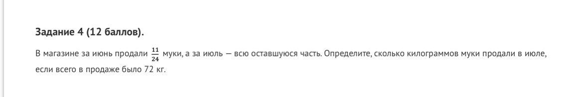 В магазине за июнь продали 11/24 муки, а за июль - всю оставшуюся часть. Определить сколько килограммов муки продали в июле, если всего в продаже было 72 кг.