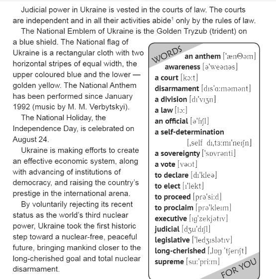 Державним Гербом України є золотий тризуб на синьому щиті. Державний прапор України являє собою прямокутне полотнище з двома горизонтальними смугами однакової ширини, верхньою — синього кольору, а нижньою — золотисто-жовтого кольору. З січня 1992 року виконується Державний Гімн (муз. М. М. Вербицького).