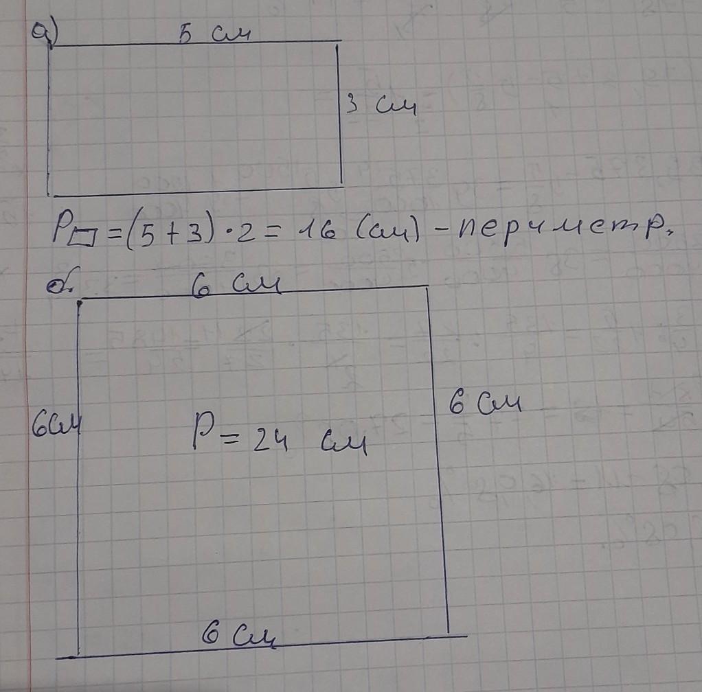 2. Построй фигуры а) Прямоугольник со сторонами 5 см и 3 см. Вычисли его периметр. б) Квадрат с периметром 24 см.