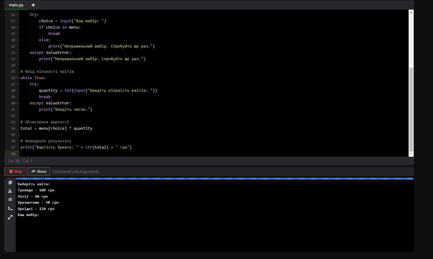 Програма створює меню з різновидами квітів та їх цінами, виводить його на екран, дозволяє користувачеві обрати квіти та ввести кількість, а потім рахує та виводить вартість букету.