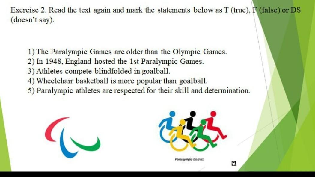 Exercise 2. Read the text again and mark the statements below as T (true), F (false) or DS (doesn't say). 1) The Paralympic Games are older than the Olympic Games. 2) In 1948, England hosted the 1st Paralympic Games. 3) Athletes compete blindfolded in goalball. 4) Wheelchair basketball is more popular than goalball. 5) Paralympic athletes are respected for their skill and determination. iij Paralympic Games