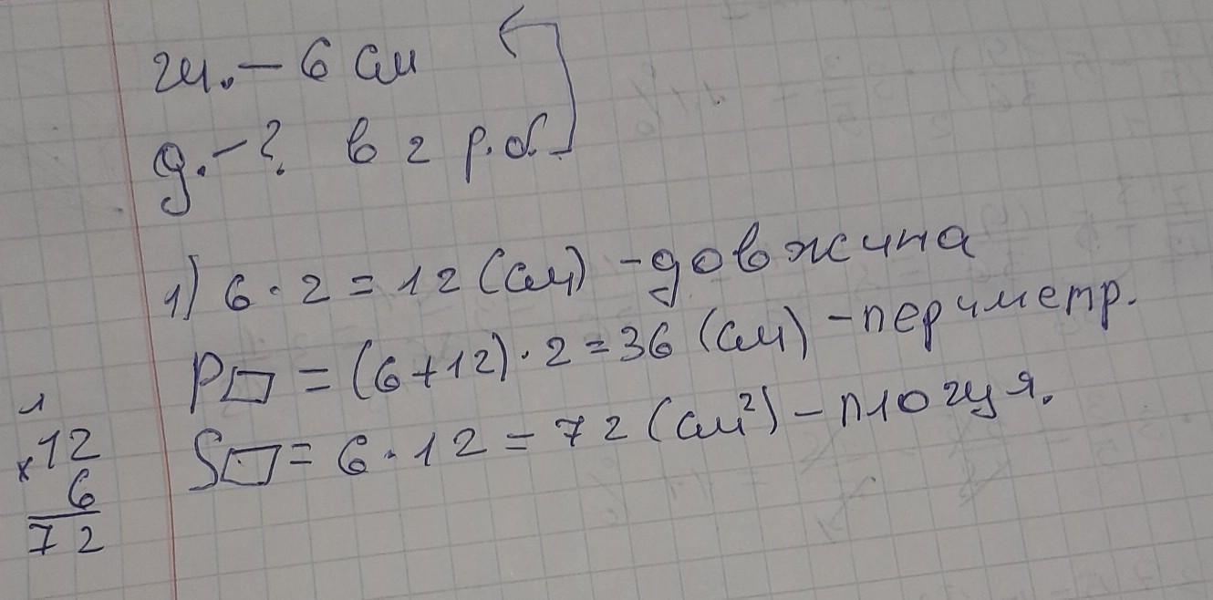 Ширина прямокутника вдвічі менша за його довжину. Обчисли площу і периметр прямокутника, якщо його ширина дорівнює 6 см.
