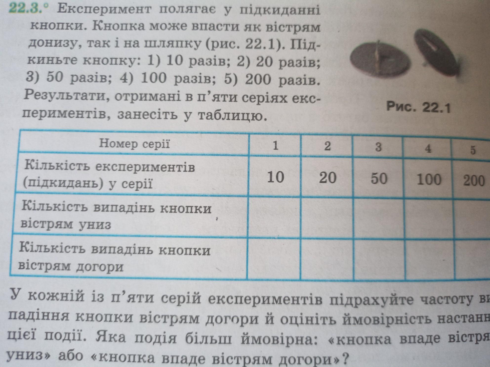 Експеримент полягає у підкиданні кнопки. Кнопка може впасти як вістрям донизу, так і на шляпку. Підкиньте кнопку: 1) 10 разів; 2) 20 разів; 3) 50 разів; 4) 100 разів; 5) 200 разів. Результати, отримані в п'яти серіях експериментів, занесіть у таблицю.
