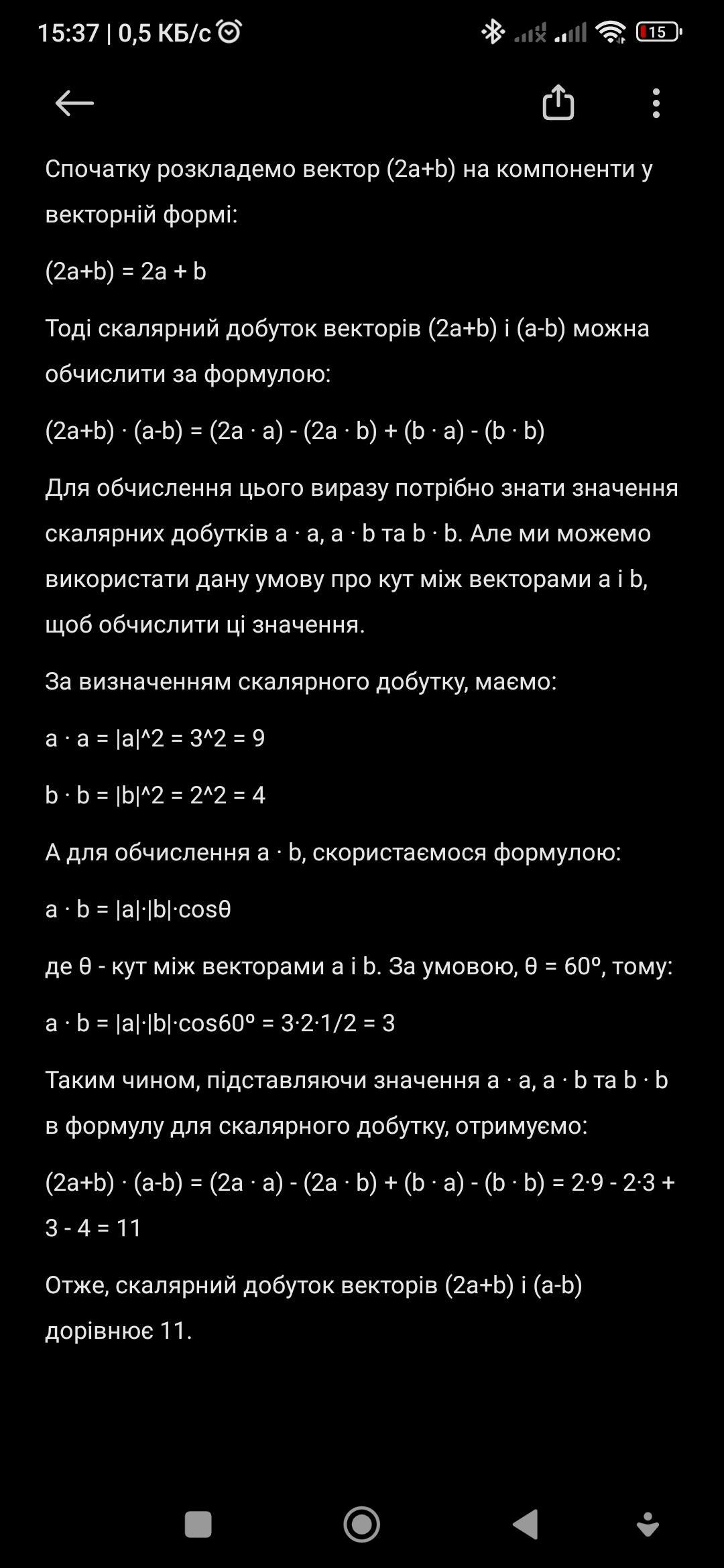 Знайти скалярний добуток векторів (2a+b)(За- b ), якщо |а | =3, |ь | = 2, кут між векторами а і b дорівнює 60º