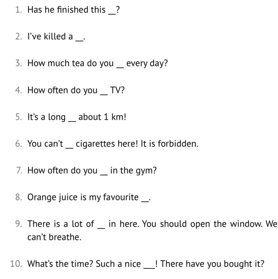 Complete the sentences with the verbs or nouns (drink/exercise/watch/smoke/fly/walk). Даю 50 баллов