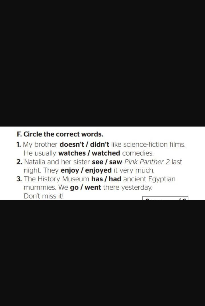F. Circle the correct words. 1. My brother doesn't / didn't like science-fiction films. He usually watches / watched comedies. 2. Natalia and her sister see / saw Pink Panther 2 last night. They enjoy / enjoyed it very much. 3. The History Museum has / had ancient Egyptian mummies. We go / went there yesterday. Don't miss it!