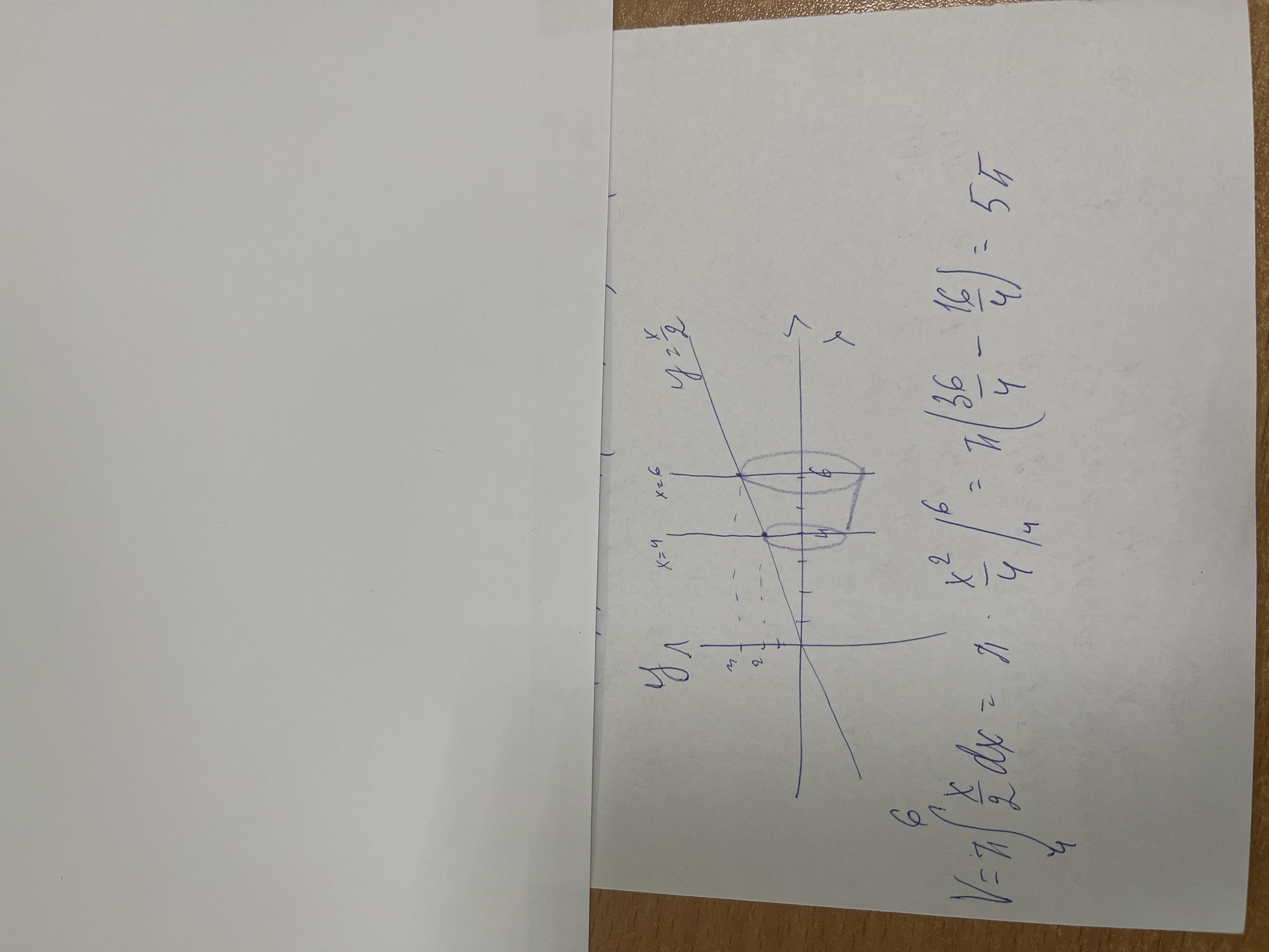 Знайдіть об'єм тіла, утвореного обертанням навколо Ox фігури, обмеженої y = x/2 , x = 4 , x = 6 .