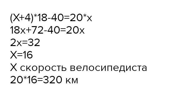 Велосипедист, увеличив скорость на 4 км/ч, за 18ч проехал на 40 км больше, чем мог проехать за 20ч, двигаясь с постоянной скоростью. Какой путь должен прохеать велосипедист.