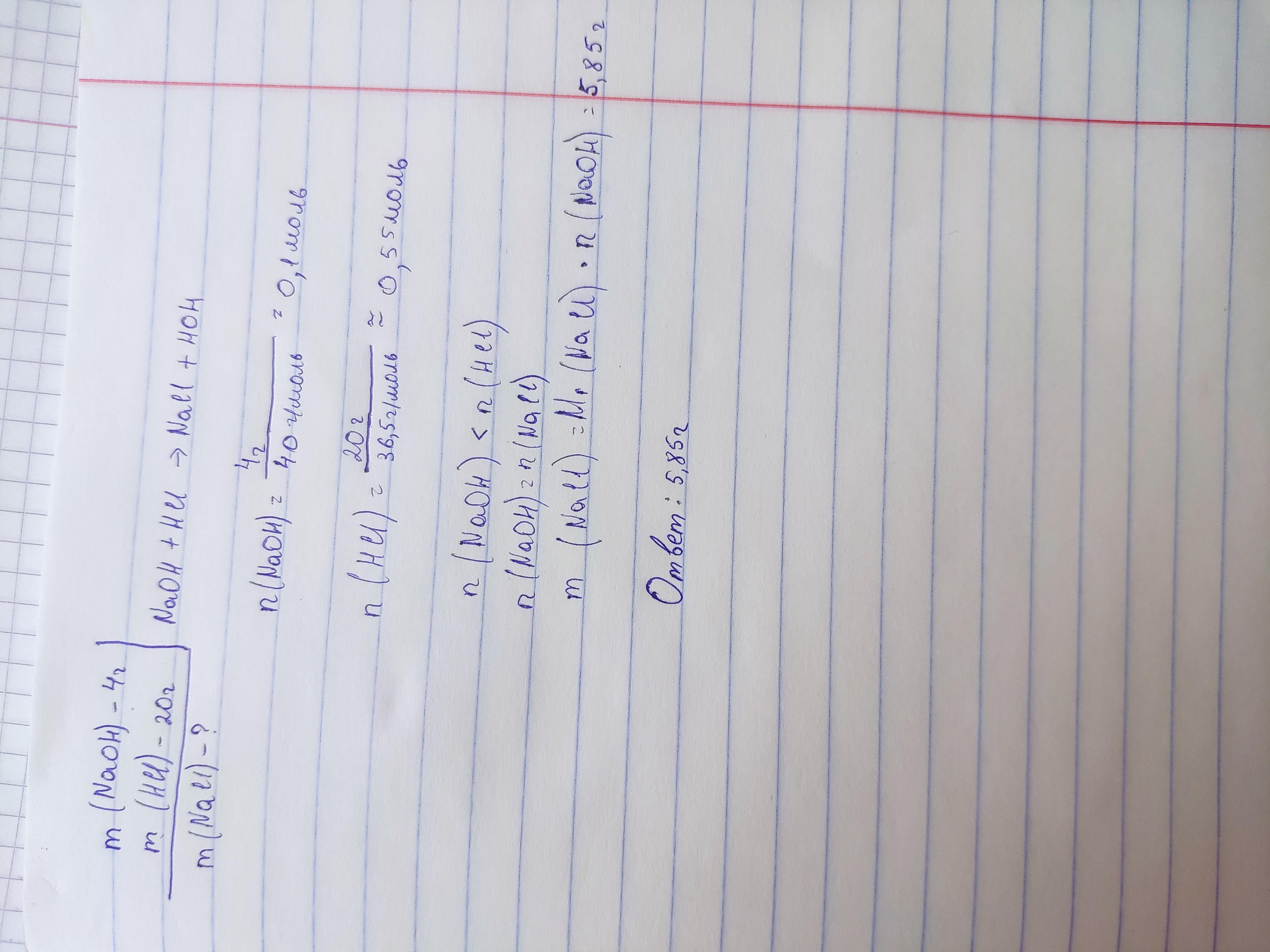 ХИМИЯ 9 КЛАСС. дана: масса NaOH-4 грамма, масса HCl-20 грамм, найти массу NaCl