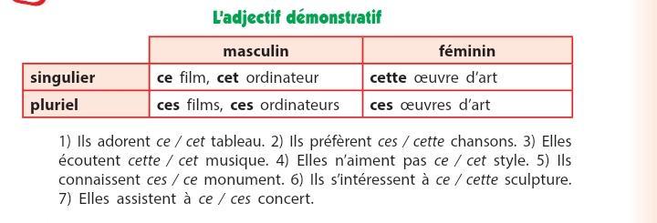1) Ils adorent ce / cet tableau. 2) Ils préfèrent ces / cette chansons. 3) Elles écoutent cette / cet musique. 4) Elles n'aiment pas ce / cet style. 5) Ils connaissent ces / ce monument. 6) Ils s'intéressent à ce / cette sculpture. 7) Elles assistent à ce / ces concert.