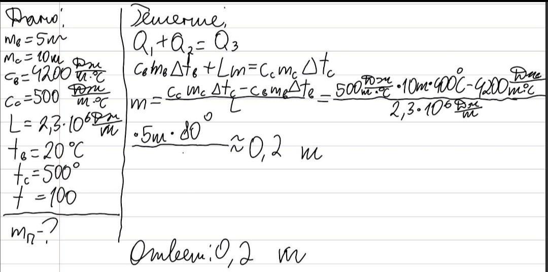 У посудину, що містить 2,8 кг води при 20°С, кидають сталеву деталь, що віддає 4,6 МДж енергії. Вода нагрівається до 100°С і частково випаровується.