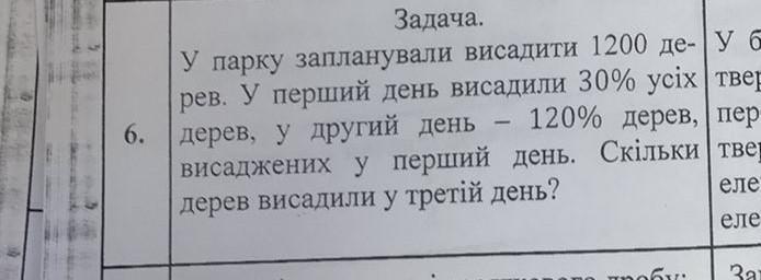 СРОЧНО!!! 6. Задача. У парку запланували висадити 1200 де- рев. У перший день висадили 30% усiх 120% дерев, дерев, у другий день висаджених у перший день. Скільки дерев висадили у третій день? -