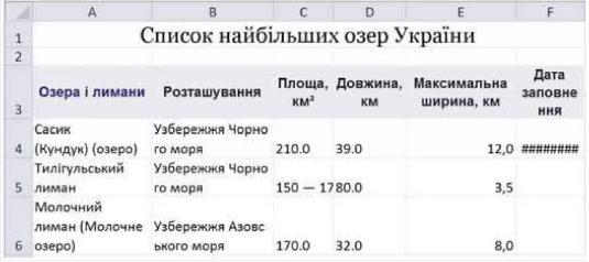 Знайдіть у вікіпедії список найбільших озер України, скопіюйте таблицю в середовище табличного процесора (мал. 15.16), змі- ніть формат даних і параметри форматування так, щоб усі дані були відображені на екрані, а таблиця мала привабливий вигляд