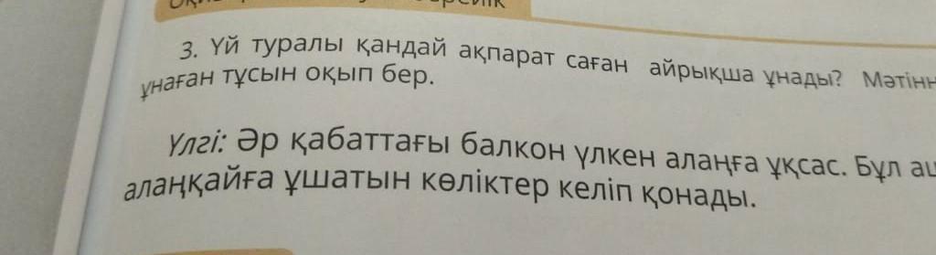 3. Үй туралы қандай ақпарат саған айрықша ұнады? Мәтіннің ұнаған тұсын оқып бер. Үлгі: Әр қабаттағы балкон үлкен алаңға ұқсас. Бұл ашық алаңқайға ұшатын көліктер келіп қонады. ойланайык