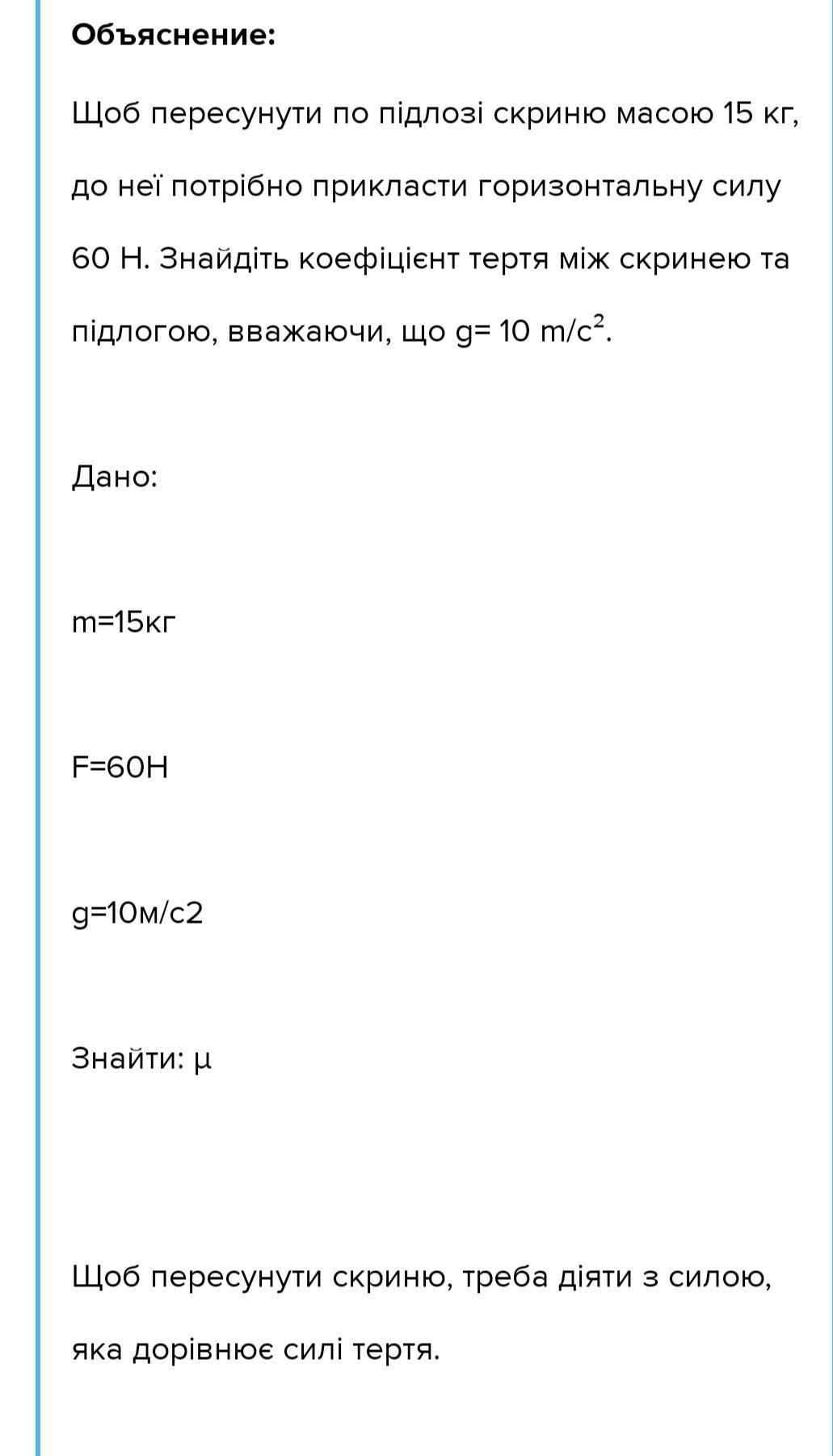Щоб пересунути по підлозі скриню масою 15 кг, до неї потрібно прикласти горизонтальну силу 60 Н. Знайдіть коефіцієнт тертя між скринею та підлогою.
