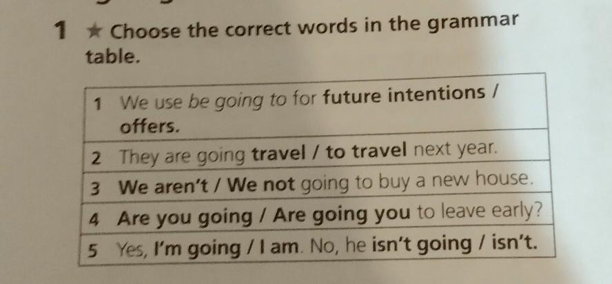 1★ Choose the correct words in the grammar table. 1 We use be going to for future intentions / offers. They are going travel / to travel next year. We aren't / We not going to buy a new house. Are you going / Are going you to leave early? 5 Yes, I'm going / I am. No, he isn't going / isn't.